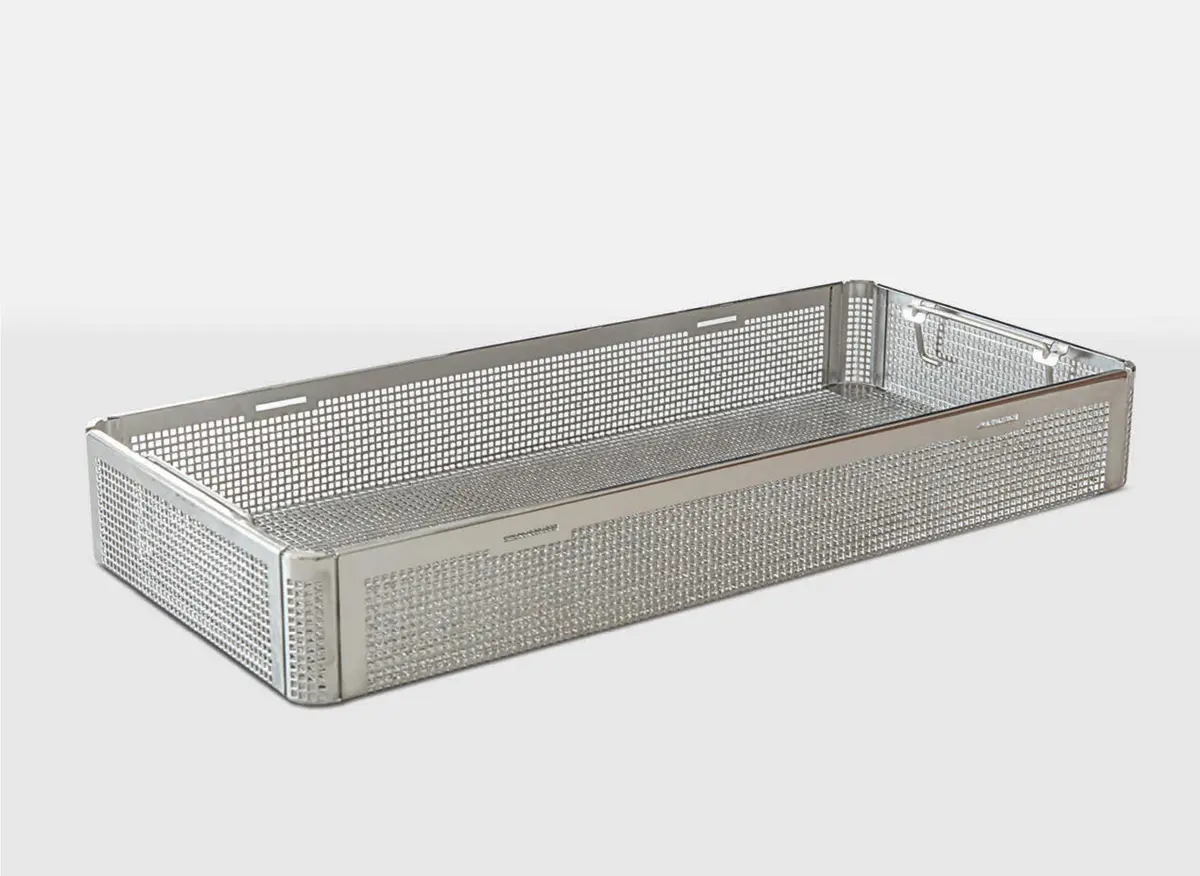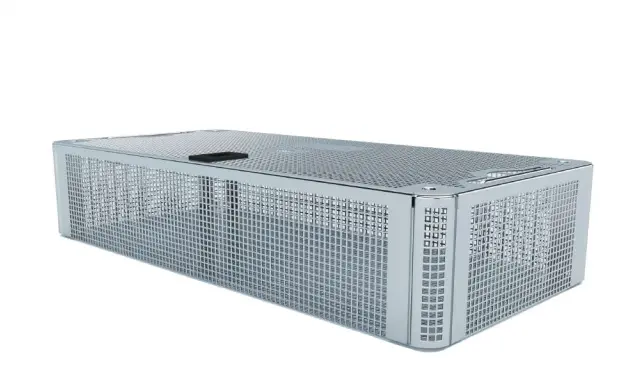 Recipiente para transportar y almacenar instrumentos quirúrgicos y otros dispositivos médicos.